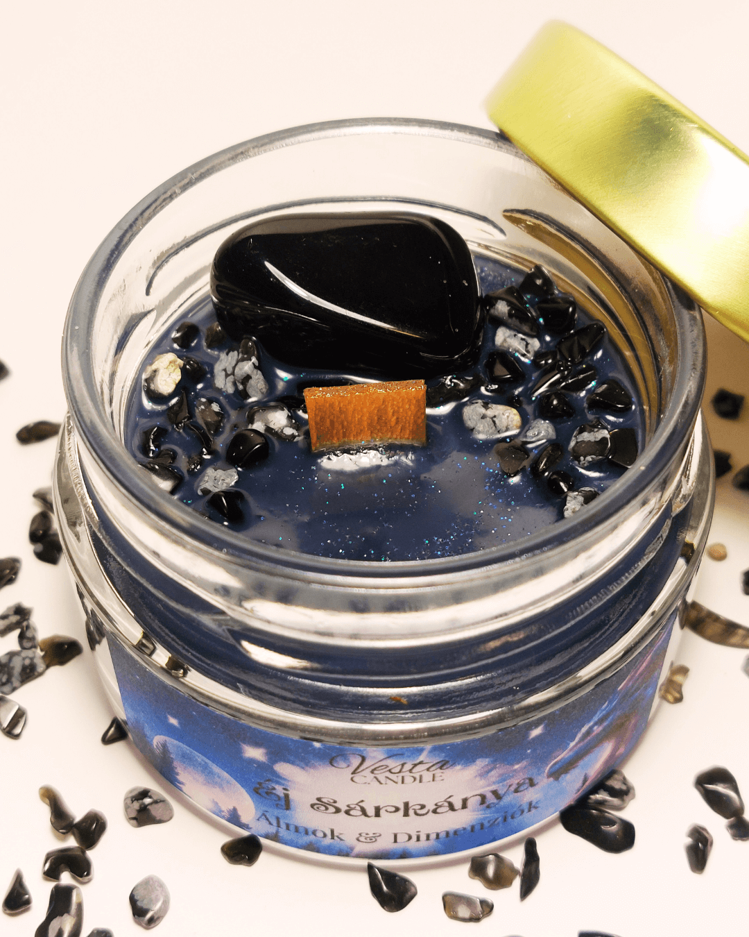 100% természetes szójaviaszból, ropogós fakanóccal készült, jázmin és szantálfa illattal. A tetejét apró hópehely obszidián ásványok és egy M-es méretű obszidián marokkő díszíti, amely programozott segíti a kapcsolódást a Éj Sárkányával.