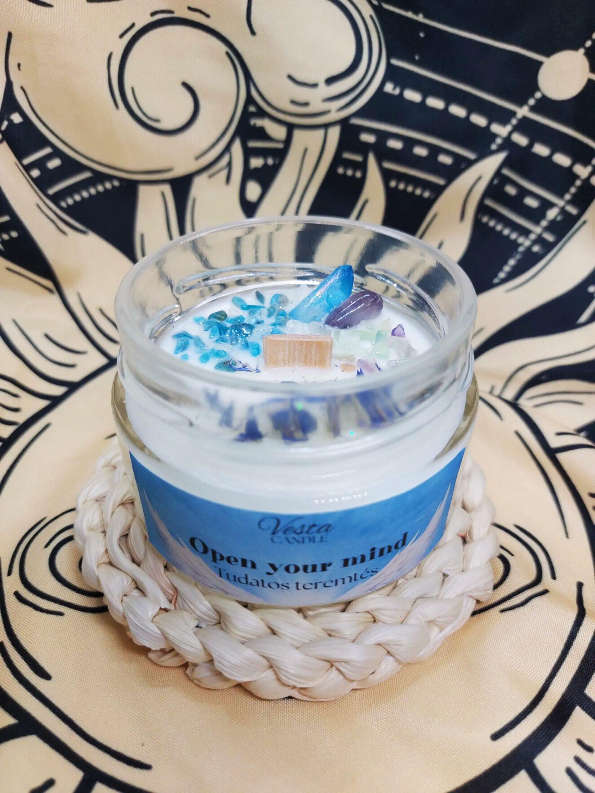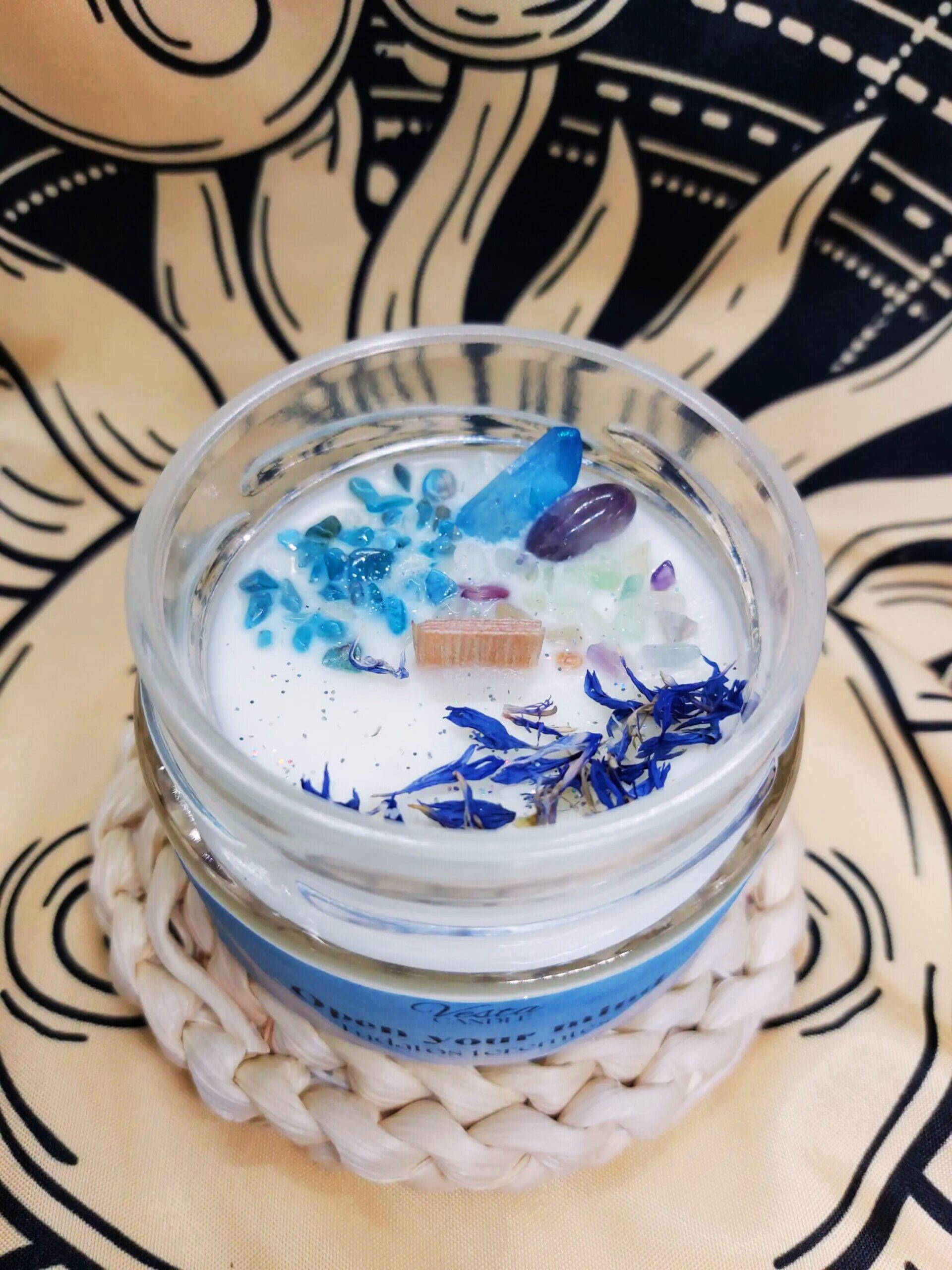 100% természetes szójaviaszból, ropogós fakanóccal készült. Citrusok, eperlevél, gyöngyvirág és szantálfa illatjegyekkel, segít megnyitni a tudatodat, hogy megteremthesd amit csak szeretnél. A gyertya tetején, kék angyal aurakvarc, apatit és szivárvány fluorit ásvány kapott helyet.