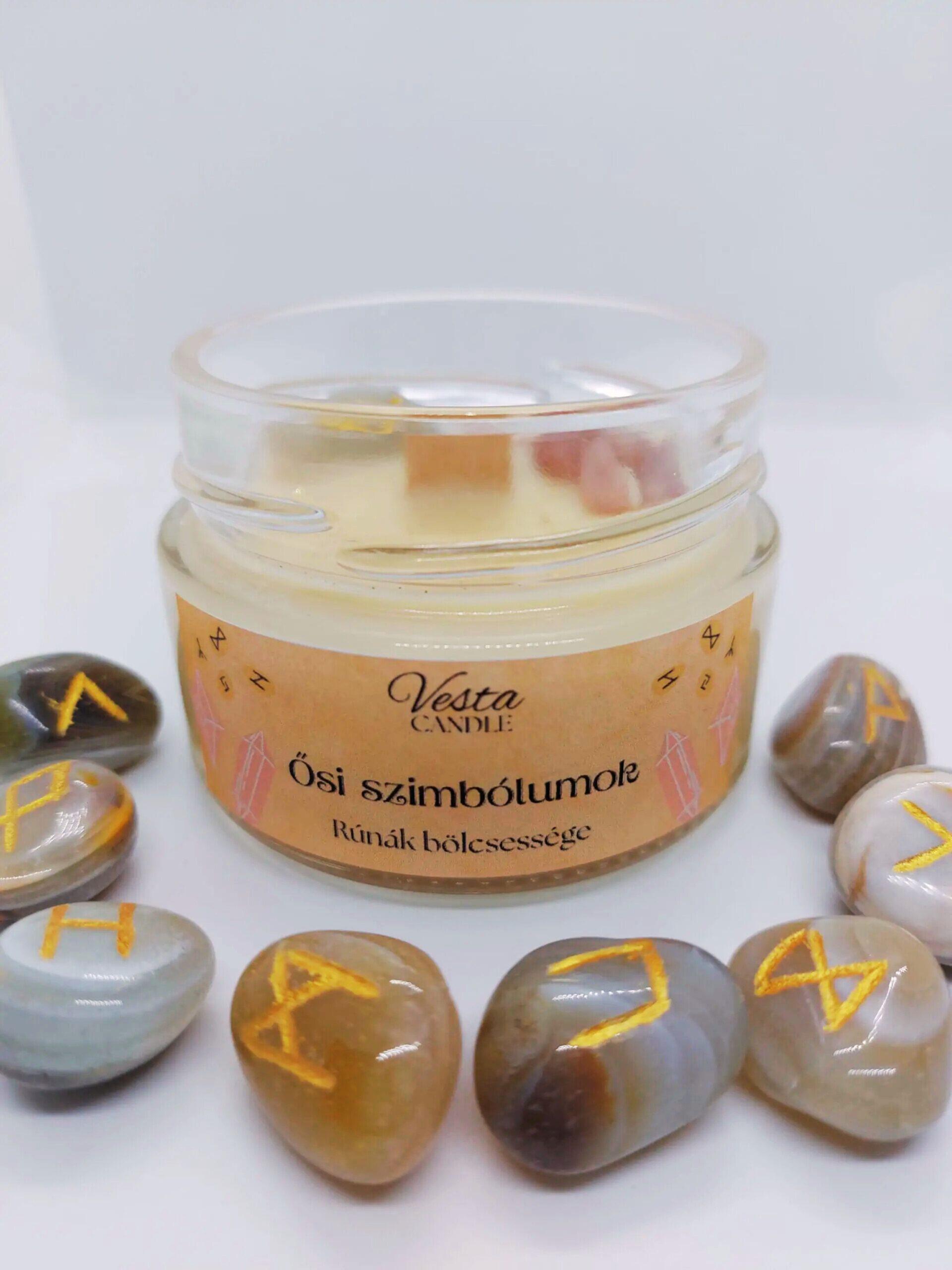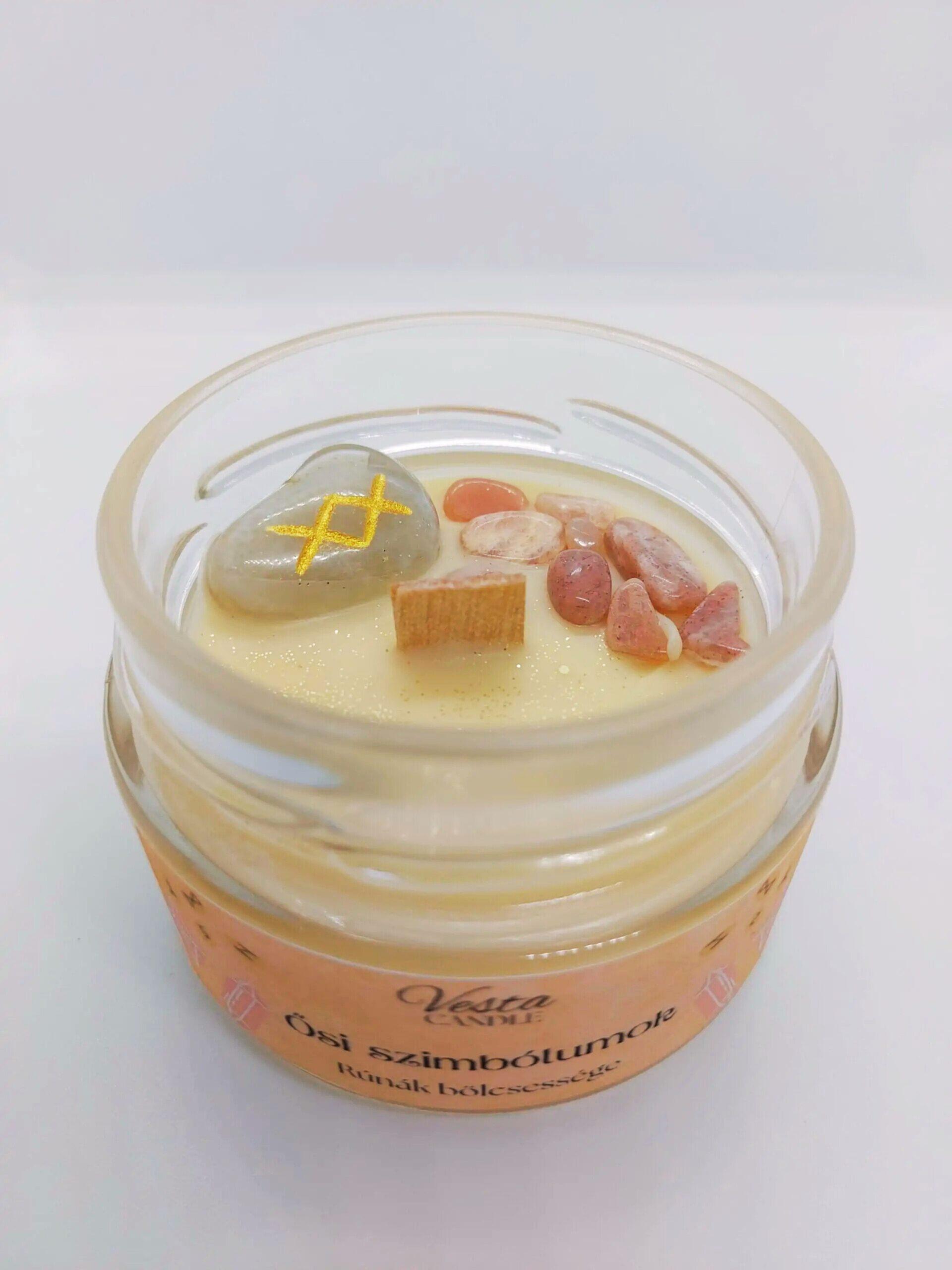 A gyertya 100% természetes szójaviaszból készült, ropogós fakanóccal, fűszeres fahéj és vajkaramella illattal. A tetején lévő rúna kövek achát ásványból készültek, mellettünk varázslatosan csillogó holdkövek kaptak helyet.