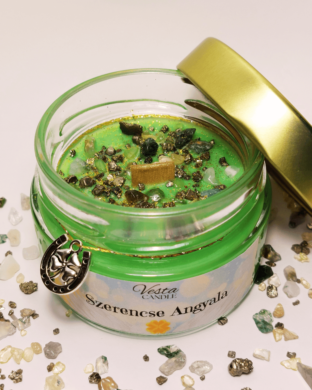 100% természetes szójaviaszból, ropogós fakanóccal és mennyei gyümölcs illattal készült. A tetején mohaachát, citrin, pirit ásványok és egy szerencsehozó medál kapott helyet.