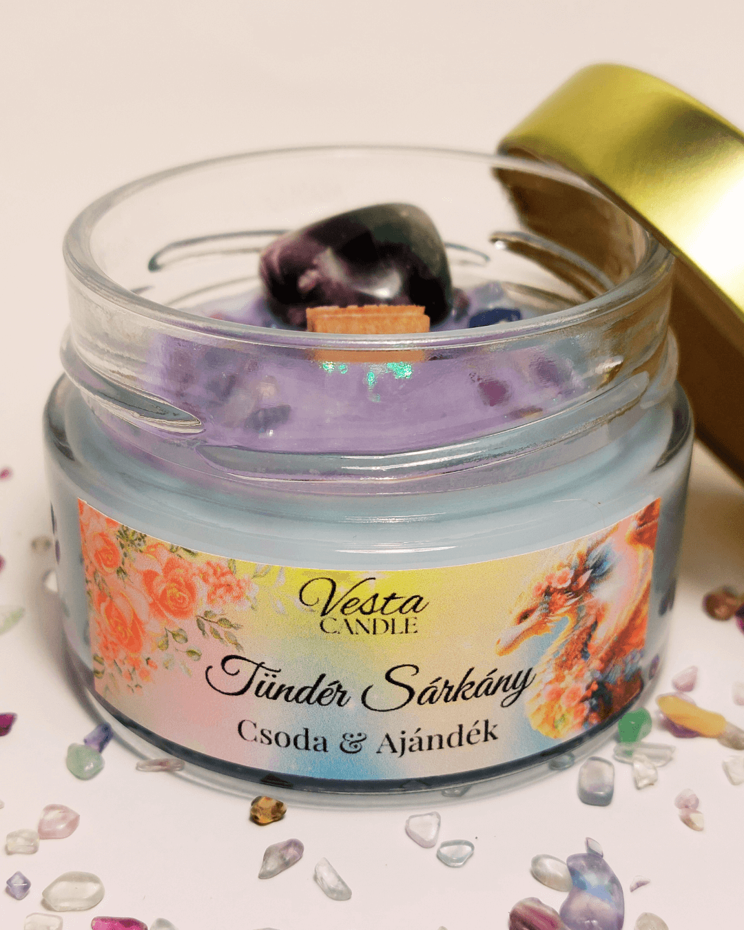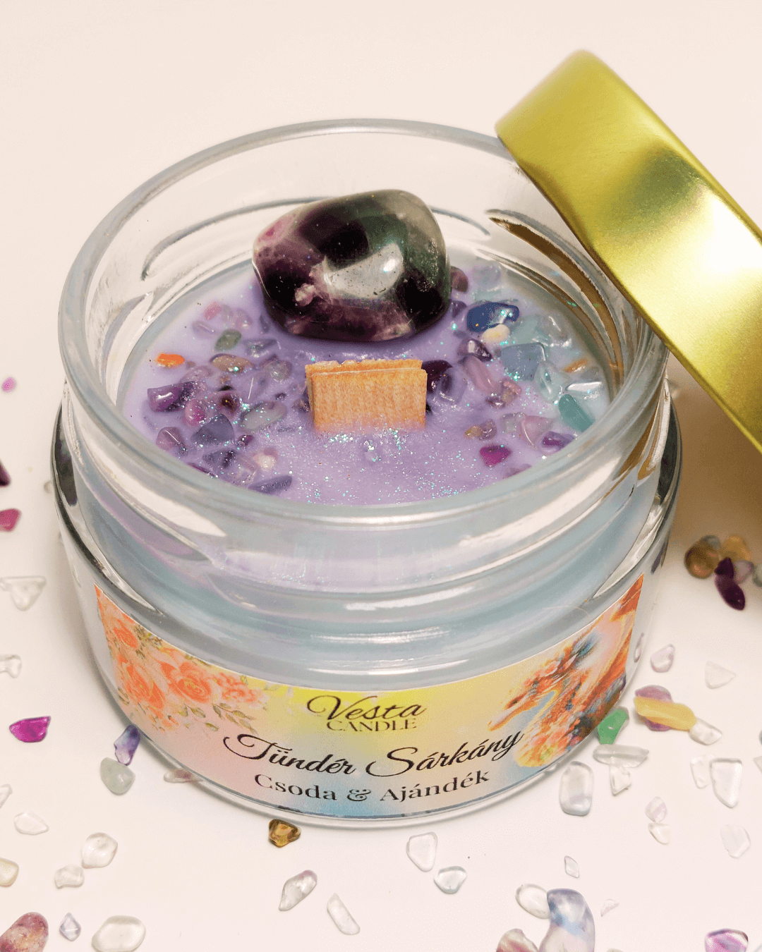 100% természetes szójaviaszból, ropogós fakanóccal készült, bazsarózsa illattal. A tetejét apró fluorit ásványok és egy M-es méretű fluorit marokkő díszíti, amely programozott segíti a kapcsolódást a Tündér Sárkánnyal.